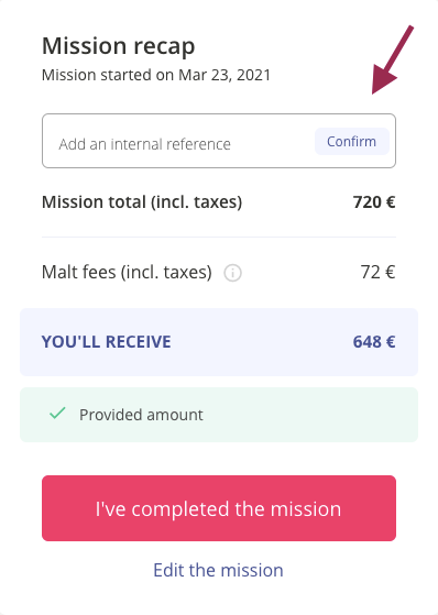 When you complete an assignment, you can see on the top left hand side an "internal reference", you can indicate here the reference number of your internal accounting system if you wish so that your accountant doesn't spend hours understanding how to manage your invoices issued by Malt.
