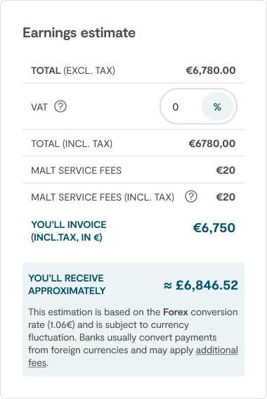 Malt accompanies your foreign client for the payment of your projects in their currency.