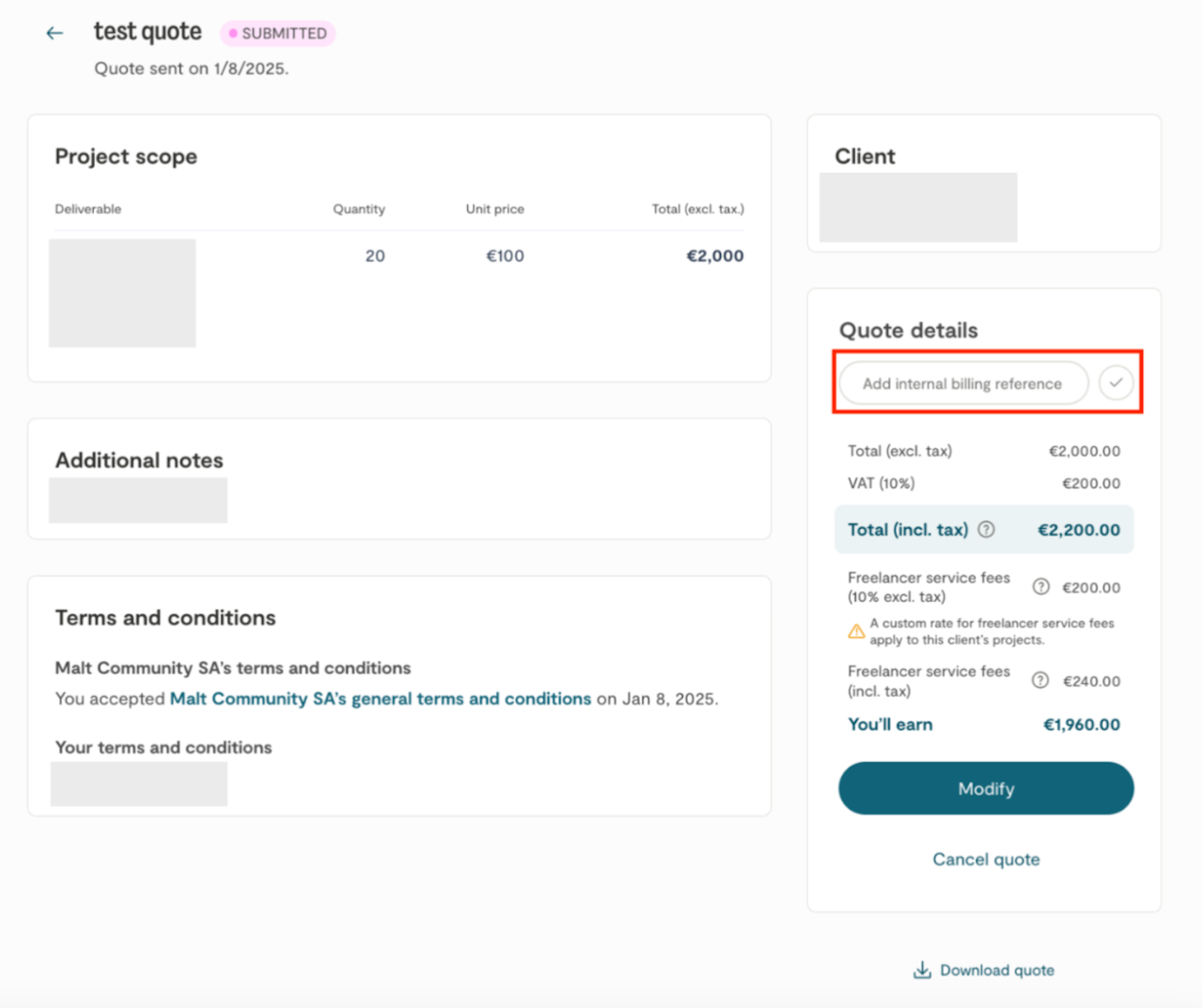 With Time-Based Prepayment, the client must pre-fund an estimated monthly amount into an escrow account at the start of the month to secure your payment. Recommendation: We strongly recommend you wait until you have received confirmation that the funds have been collected before you begin or continue any work. Why does Malt use this estimate? The primary advantage is to secure your payment baseline by ensuring funds are already collected in escrow before you start work, significantly reducing your financial risk. How is it calculated? Malt calculates this estimate to ensure a fair monthly distribution of the total project work. The Full Project Estimated Number of Days (from your quote) is divided by the Total Number of Months the project occurs (based on the start and end dates in your quote). Example: If your quote states you plan to work 20 days between January 10th and April 10th (4 calendar months: Jan, Feb, Mar, Apr), the estimate is 5 days/month (20 days / 4 months). You are required to submit a timesheet or activity report at the end of the month, declaring the actual number of days you've worked. Your final payment will be adjusted based on the actual, approved days worked. You receive your payment once the activity report is approved by the client and once the client has paid the final adjusted amount. Important: If you have worked more than the estimated, pre-funded number of days, the client is asked to pay a final balance for the extra work. You will only receive your full payment once the client has paid this final balance. What if the client is late paying the final balance? If the client is significantly delayed in paying (= more than 30 days) the final balance for extra days worked , you can reach out to support@malt.com to request a partial payment of the amount that was already prepaid and held in escrow.