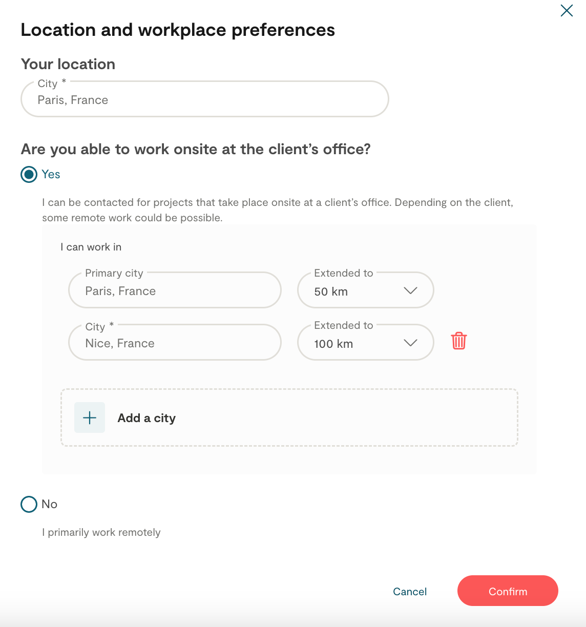Travel: Are you flexible and agree to go on assignments with the client, or are you remote exclusively? You can also indicate that you only do part of the project with the client. The 0 movement is the only preference that cannot be deleted, it must be filled in.