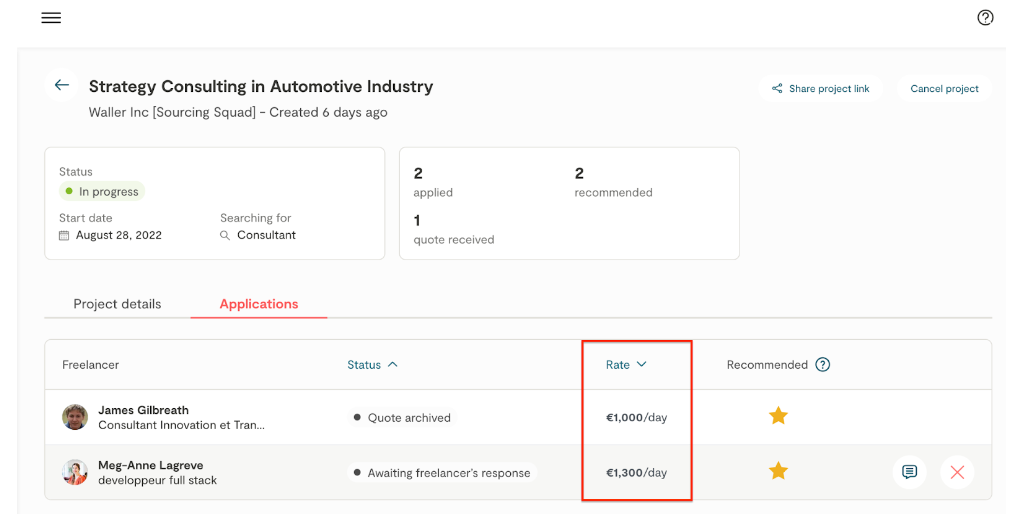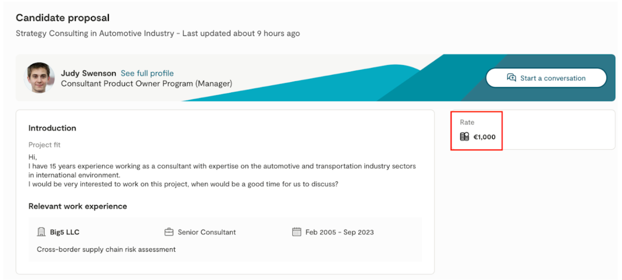 When applying for a project, Malt Strategy consultants are asked to complete an application form which includes the following responses: an introductory message, any limitations on availability and location, relevant previous experience and rate daily billed for the project.